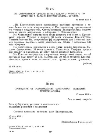 Из оперативной сводки штаба Южного фронта о положении в районе Екатеринослав — Харьков. 15 июля 1919 г.