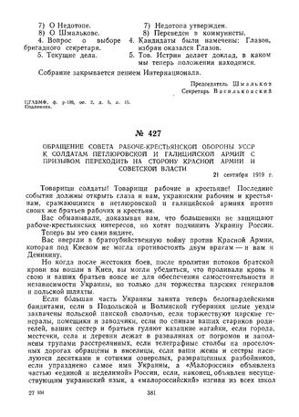 Обращение Совета Рабоче-Крестьянской Обороны УССР к солдатам петлюровской и Галицийской армий с призывом переходить на сторону Красной Армии и Советской власти. 21 сентября 1919 г. // Журн. «Коммунист», № 1, 25 сентября 1919 г.