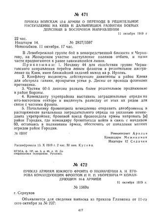 Приказ армиям Южного фронта о назначении А.И. Егорова командующим фронтом и И.П. Уборевича командующим 14-й армией. 11 октября 1919 г.