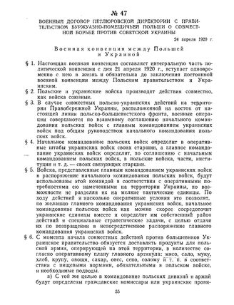 Военный договор петлюровской Директории с правительством буржуазно-помещичьей Польши о совместной борьбе против Советской Украины. 24 апреля 1920 г. // ЦГАОР УССР, ф. 1439, оп. 1, д. 29-а, лл. 2—3. Стеклографический оттиск.