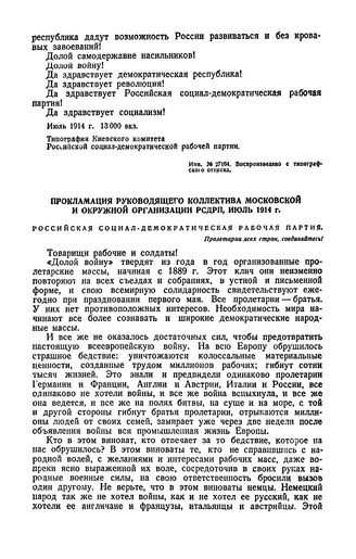 Прокламация руководящего коллектива Московской окружной организации РСДРП, июль 1914 г.