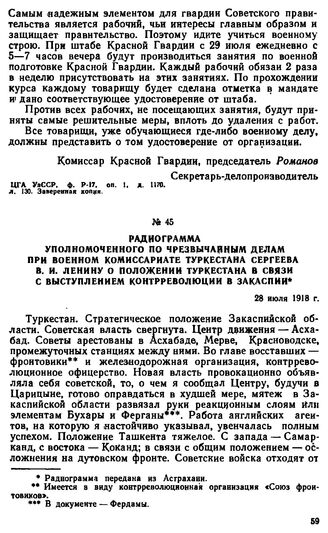 Радиограмма уполномоченного по чрезвычайным делам при военном комиссариате Туркестана Сергеева В.И. Ленину о положении Туркестана в связи с выступлением контрреволюции в Закаспии. 28 июля 1918 г. // ЦГАОР СССР, ф. 130, оп. 2, д. 741, л. 274. Копия.