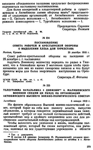 Постановление Совета Рабочей и Крестьянской Обороны о выделении хлеба для Туркестана. 23 декабря 1918 г.