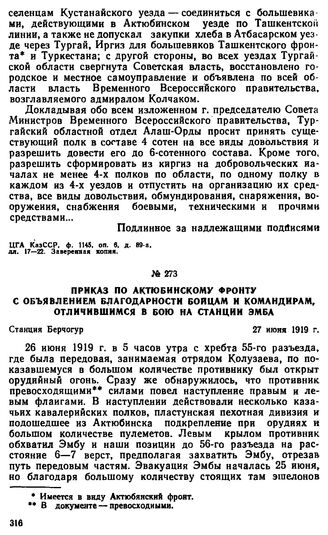 Приказ по Актюбинскому фронту с объявлением благодарности бойцам и командирам, отличившимся в бою на станции Эмба. 27 июня 1919 г. // Партархив Института истории КПУз - филиала ИМЛ при КПСС, ф. 499, оп. 1, д. 350, лл. 63—69. Копия.
