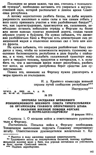 Протокол заседания временного Революционного Военного Совета Туркреспублики об организации Главного оперативного штаба и оказании военной помощи Фергане и Петро-Александровску. 10 февраля 1919 г. // ЦГА УзССР, ф. P-25, оп. 1, д. 144, л. 320. Копия.