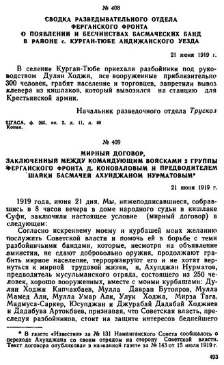 Сводка разведывательного отдела Ферганского фронта о появлении и бесчинствах басмаческих банд в районе с. Курган-Тюбе Андижанского уезда. 21 июня 1919 г. // ЦГАСА, ф. 265, оп. 2, д. 11, л. 68. Копия.