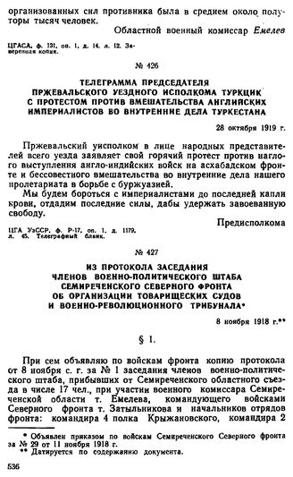 Из протокола заседания членов военно-политического штаба Семиреченского Северного фронта об организации товарищеских судов и военно-революционного трибунала. 8 ноября 1918 г. // ЦГАСА, ф. 131, оп. 1, д. 14, л. 22.