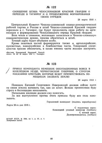 Сообщение штаба Чехословацкой Красной гвардии о переезде в Таганрог и о продолжении формирования своих отрядов. 28 марта 1918 г. // «Вестник Украинской Народной Республики», № 49, 28 марта 1918 г., Таганрог.