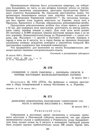 Донесение информатора Полтавскому губернскому старосте о попытке восстания в г. Ромнах. 22 августа 1918 г. // ЦГАОР УССР, ф. 2586, оп. 1, д. 24, л. 81. Незаверенная копия.