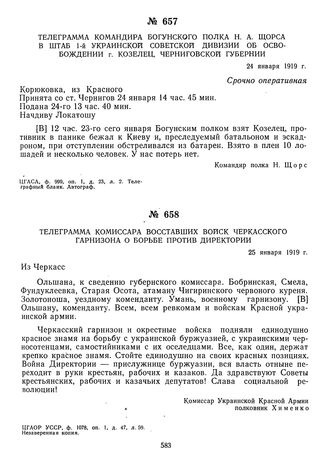Телеграмма комиссара восставших войск Черкасского гарнизона о борьбе против Директории. 25 января 1919 г. // ЦГАОР УССР, ф. 1078, оп. 1, д. 47, л. 59. Незаверенная копия.