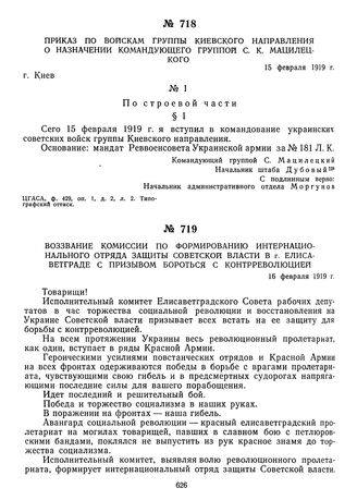 Воззвание комиссии по формированию интернационального отряда защиты Советской власти в г. Елисаветграде с призывом бороться с контрреволюцией. 16 февраля 1919 г.