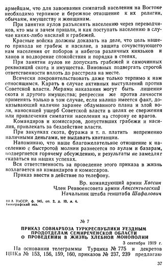 Приказ Совнархоза Туркреспублики уездным продотделам Семиреченской области о проведении в жизнь хлебной монополии. 3 сентября 1919 г. // Госархив Алма-Атинской обл., ф. 79, оп. 1, д. 253, л. 93. Копия.