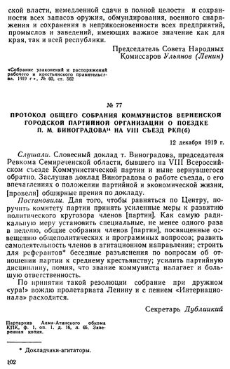 Протокол общего собрания коммунистов Верненской городской партийной организации о поездке П.М. Виноградова на VIII съезд РКП(б). 12 декабря 1919 г. // Партархив Алма-Атинского обкома КПК, ф. 1, оп. 1, д. 16, л. 65. Заверенная копия.