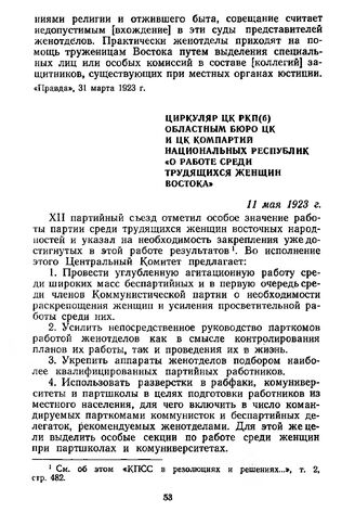 Циркуляр ЦК РКП(б) областным бюро ЦК и ЦК компартий национальных республик «О работе среди трудящихся женщин Востока». 11 мая 1923 г. // «Известия ЦК РКП(б)», 1923, № 6, стр. 82.