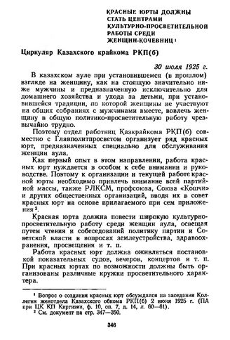 Красные юрты должны стать центрами культурно-просветительной работы среди женщин-кочевниц. Циркуляр Казахского крайкома РКП(б). 30 июля 1925 г. // ПА Казфилиала ИМЛ, ф. 139, оп. 1, д. 1264, л. 34, 34 об. Копия.