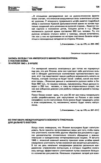 Запись беседы г-на имперского министра Риббентропа с послом Осима 18 апреля 1943 г. в Фушле // ЦГАОРСС, ф. 7867, оп. 1, «Стенограммы...», ед. хр. 275, лл. 307-311.