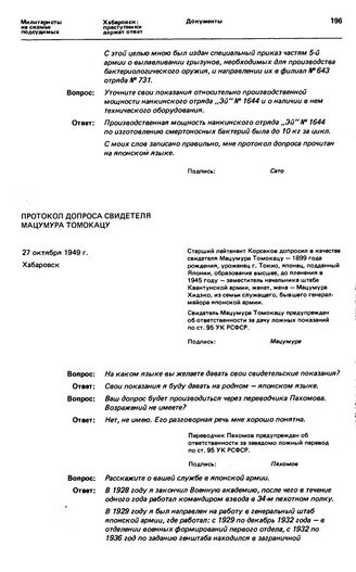 Показания обвиняемых и свидетелей. Протокол допроса свидетеля Мацумура Томокацу. г. Хабаровск, 27 октября 1949 г.