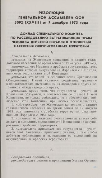 Резолюция Генеральной Ассамблеи ООН 3092 (XXVIII) от 7 декабря 1973 года. Доклад Специального комитета по расследованию затрагивающих права человека действий Израиля в отношении населения оккупированных территории