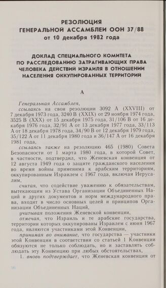 Резолюция Генеральной Ассамблеи ООН 37/88 от 10 декабря 1982 года. Доклад Специального комитета по расследованию затрагивающих права человека действий Израиля в отношении населения оккупированных территории