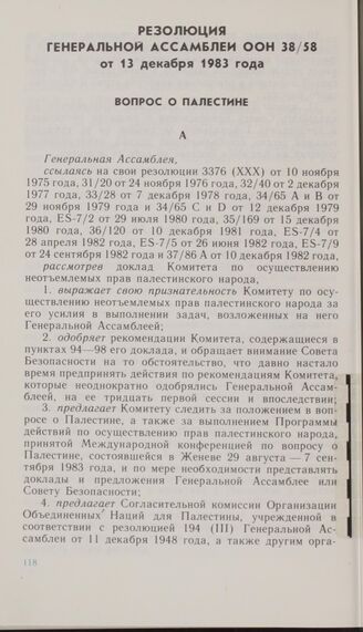 Резолюция Генеральной Ассамблеи ООН 38/58 от 13 декабря 1983 года. Вопрос о Палестине