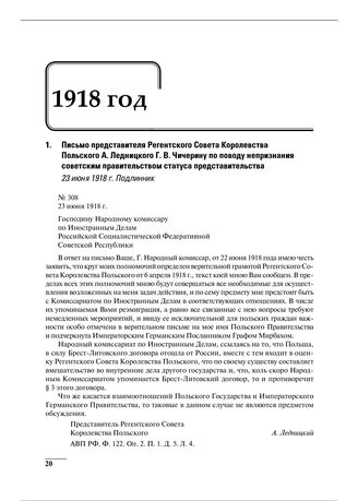 Письмо представителя Регентского Совета Королевства Польского А. Ледницкого Г.В. Чичерину по поводу непризнания советским правительством статуса представительства. 23 июня 1918 г. // АВП РФ. Ф. 122. Оп. 2. П. 1. Д. 5. Л. 4.