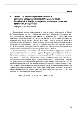 Письмо Г.В. Чичерина представителю РСФСР в Литовско-Белорусской Советской Социалистической Республике А.А. Иоффе о содержании переговоров с польским делегатом А. Венцковским. 26 марта 1919 г. // АВП РФ. Ф. 04. Оп. 51. П. 326. Д. 55002. Л. 34.