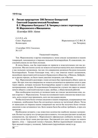 Письмо председателя СНК Литовско-Белорусской Советской Социалистической Республики В.С. Мицкевича-Капсукаса Г.В. Чичерину в связи с переговорами Ю. Мархлевского в Микашевичах. 13 октября 1919 г. // АВП РФ. Ф. 122. Оп. 2. П. 3. Д. 16. Л. 45–46.