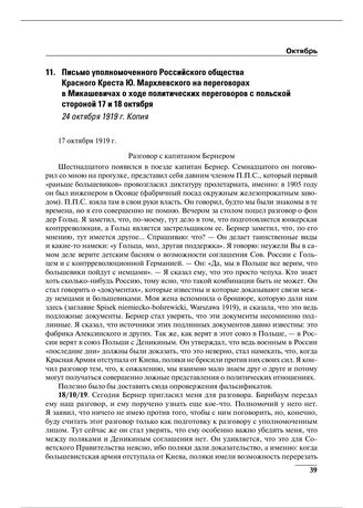 Письмо уполномоченного Российского общества Красного Креста Ю. Мархлевского на переговорах в Микашевичах о ходе политических переговоров с польской стороной 17 и 18 октября. 24 октября 1919 г. // АВП РФ. Ф. 04. Оп. 32. П. 203. Д. 52406. Л. 9–10.