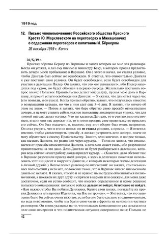 Письмо уполномоченного Российского общества Красного Креста Ю. Мархлевского на переговорах в Микашевичах о содержании переговоров с капитаном И. Бернером. 26 октября 1919 г. // АВП РФ. Ф. 04. Оп. 32. П. 203. Д. 52406. Л. 12.