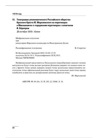 Телеграмма уполномоченного Российского общества Красного Креста Ю. Мархлевского на переговорах в Микашевичах о содержании переговоров с капитаном И. Бернером. 28 октября 1919 г. // АВП РФ. Ф. 04. Оп. 32. П. 203. Д. 52406. Л. 18.