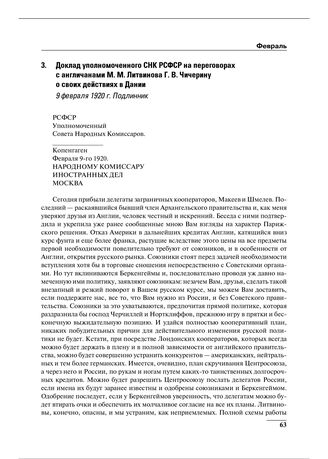 Доклад уполномоченного СНК РСФСР на переговорах с англичанами М.М. Литвинова Г.В. Чичерину о своих действиях в Дании. 9 февраля 1920 г. // АВП РФ. Ф. 0168. Оп. 1. П. 1. Д. 1. Л. 41–42.