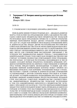 Телеграмма Г.В. Чичерина министру иностранных дел Эстонии А. Бирку. 29 марта 1920 г.