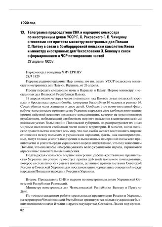 Телеграмма председателя СНК и народного комиссара по иностранным делам УССР Г.Х. Раковского Г.В. Чичерину с текстами нот протеста министру иностранных дел Польши С. Патеку в связи с бомбардировкой польским самолетом Киева и министру иностранных дел Чехословакии Э. Бенешу в связи с формированием в ЧСР петлюровских частей. 28 апреля 1920 г. // АВП РФ. Ф. 219. (НКИД Украины). Оп. 4. П. 23. Д. 44. Л. 50–55.