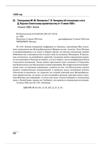 Телеграмма М.М. Литвинова Г.В. Чичерину об отношении к ноте Д. Керзона Советскому правительству от 11 июля 1920 г. 14 июля 1920 г. // АВП РФ. Ф. 04. Оп. 32. П. 205. Д. 25. Л. 34.