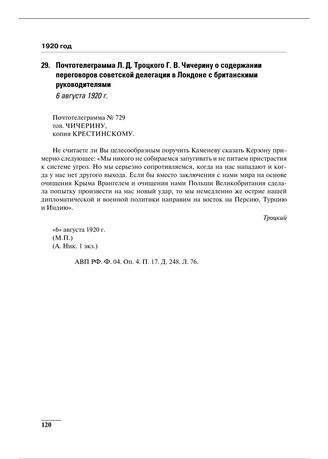 Почтотелеграмма Л.Д. Троцкого Г.В. Чичерину о содержании переговоров советской делегации в Лондоне с британскими руководителями. 6 августа 1920 г. // АВП РФ. Ф. 04. Оп. 4. П. 17. Д. 248. Л. 76.
