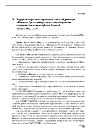 Выдержки из протокола переговоров советской делегации в Лондоне с британскими руководителями об условиях перемирия советских республик с Польшей. 6 августа 1920 г. // АВП РФ. Ф. 04. Оп. 4. П. 18. Д. 257. Л. 7–46, 52.