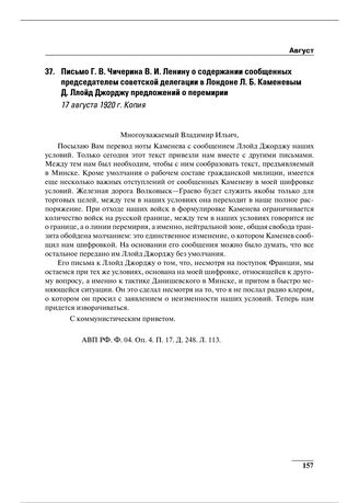 Письмо Г.В. Чичерина В.И. Ленину о содержании сообщенных председателем советской делегации в Лондоне Л.Б. Каменевым Д. Ллойд Джорджу предложений о перемирии. 17 августа 1920 г.
