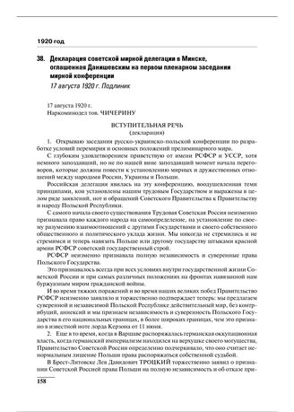 Декларация советской мирной делегации в Минске, оглашенная Данишевским на первом пленарном заседании мирной конференции. 17 августа 1920 г. // АВП РФ. Ф. 04. Оп. 32. П. 205. Д. 37. Л. 9–14.