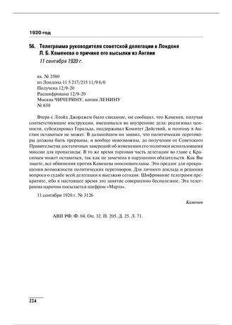 Телеграмма руководителя советской делегации в Лондоне Л.Б. Каменева о причине его высылки из Англии. 11 сентября 1920 г. // АВП РФ. Ф. 04. Оп. 32. П. 205. Д. 25. Л. 71.