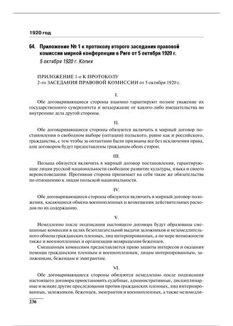 Приложение № 1 к протоколу второго заседания правовой комиссии мирной конференции в Риге от 5 октября 1920 г. 5 октября 1920 г.