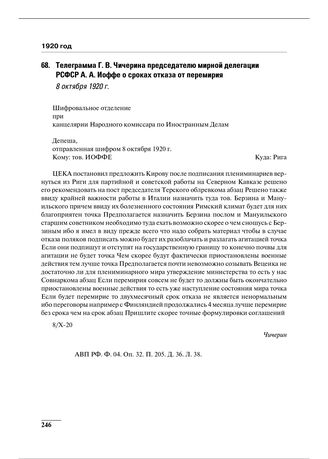 Телеграмма Г.В. Чичерина председателю мирной делегации РСФСР А.А. Иоффе о сроках отказа от перемирия. 8 октября 1920 г. // АВП РФ. Ф. 04. Оп. 32. П. 205. Д. 36. Л. 38.