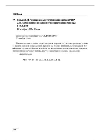 Письмо Г.В. Чичерина заместителю председателя РВСР Э.М. Склянскому о возможности корректировки границы с Польшей. 20 ноября 1920 г. // АВП РФ. Ф. 122. Оп. 3. П. 5. Д.14 а. Л. 12.