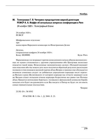 Телеграмма Г.В. Чичерина председателю мирной делегации РСФСР А.А. Иоффе об актуальных вопросах конференции в Риге. 24 ноября 1920 г. // РГАСПИ. Ф. 5. Оп. 1. Д. 2000. Л. 23.