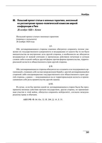 Польский проект статьи о военных гарантиях, внесенный на рассмотрение правно-политической комиссии мирной конференции в Риге. 26 ноября 1920 г. // АВП РФ. Ф. 04. Оп. 32. П. 204. Д. 14. Л. 35.