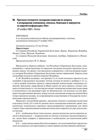 Протокол четвертого заседания комиссии по вопросу о возвращении заложников, пленных, беженцев и эмигрантов на мирной конференции в Риге. 27 ноября 1920 г.