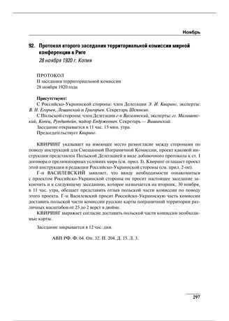 Протокол второго заседания территориальной комиссии мирной конференции в Риге. 28 ноября 1920 г. // АВП РФ. Ф. 04. Оп. 32. П. 204. Д. 15. Л. 3.