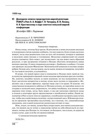Докладная записка председателя мирной делегации РСФСР в Риге А.А. Иоффе Г.В. Чичерину, В.И. Ленину, Н.Н. Крестинскому о ходе советско-польской мирной конференции. 30 ноября 1920 г.