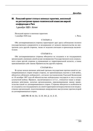 Польский проект статьи о военных гарантиях, внесенный на рассмотрение правно-политической комиссии мирной конференции в Риге. 1 декабря 1920 г. // АВП РФ. Ф. 04. Оп. 32. П. 204. Д. 14. Л. 45.