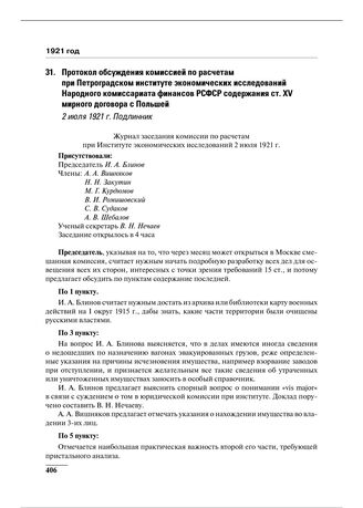 Протокол обсуждения комиссией по расчетам при Петроградском институте экономических исследований Народного комиссариата финансов РСФСР содержания ст. XV мирного договора с Польшей. 2 июля 1921 г. // АВП РФ. Ф. НКИД РСФСР. Оп. 5. П. 56. Д. 3. Л. 3–5.