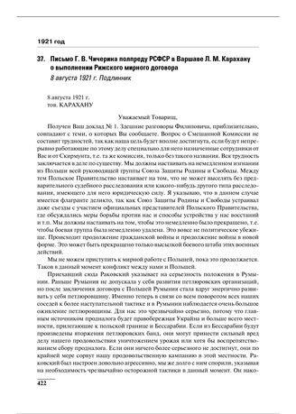 Письмо Г.В. Чичерина полпреду РСФСР в Варшаве Л.М. Карахану о выполнении Рижского мирного договора. 8 августа 1921 г. // АВП РФ. Ф. 04. Оп. 32. П. 209. Д. 85. Л. 9–11.